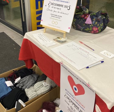 Merci aux donactrices et donacteurs pour leur altruisme et merci à Caroline et son équipe magique pour leur accueil et leur soutien. Nous avons pu échanger et expliquer nos actions auprès des démunis et des sans abri à l'occasion de cette collecte à un grand nombre de client du magasin et ainsi mettre à l'honneur la considération et l'altruisme. Infiniment merci. Soyons le changement que l'on souhaite voir dans ce monde.