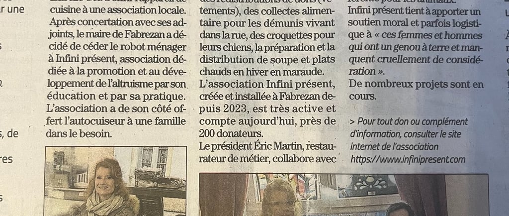 A l'occasion du don d'un auto cuiseur engendré par Mme Le Maire de Fabrezan, notre village de coeur, un article de de presse résumant parfaitement nos actions d'éducation et de pratique de l'altruisme est sorti vendredi 26 décembre dans l'indépendant. Mille mercis à Mylène, la journaliste qui a parfaitement compris et expliqué le sens et l'objet de notre association. Merci à Isabelle Géa pour avoir pensée à nous et à Rosy de Coursan pour son don. L'auto cuiseur a pour destinataire une femme seule en situation d'urgence qui a un bébé et 2 petits garçons. Fabrezan, village de l'altruisme !